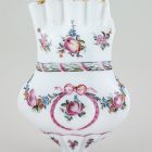 The bun-shaped vase stands on a narrow, short foot. It has a straight neck, ending in five pipes called "fingers". Just above the foot, the bottom of the vase is divided into eight fields. Each field is decorated with a flower, painted in purple and black. The body of the vase shows a medallion, with a tied ribbon at the top, enclosed by a laurel wreath, among purple, red, blue and green bunches and garlands. The medallion shows a bunch, painted in purple, blue and green, and on the opposing side, a butterfly, painted in black, yellow and purple, in an identical framework. The bottom of the neck is lined with a laurel garland, tied with a purple ribbon, surmounted with grapes, pears and flowers, painted in red, green, blue and black. The rims of the "fingers" are gilt. Its companion piece, once in the collection of Baron Jeno Nyary, has been damaged.