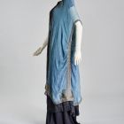 This Greek-inspired dress was at first only worn as a housedress, but it proved to be too long for this. It was possible to adjust the length and width of the gown by pulling a cord adorned with glass Murano beads running along the side seams and the arm holes. The dense, vertical pleating, which may have contained as many as 450 folds, was first made by hand, and then by using heated copper or ceramic rods. Fortuny also designed dress materials himself. Besides black, the Delphos gown was also available in coral red or ultramarine blue. It was worn with a belt or some other Fortuny creation, such as a Knossos scarf or a tunic inspired by the Greek Peplos.