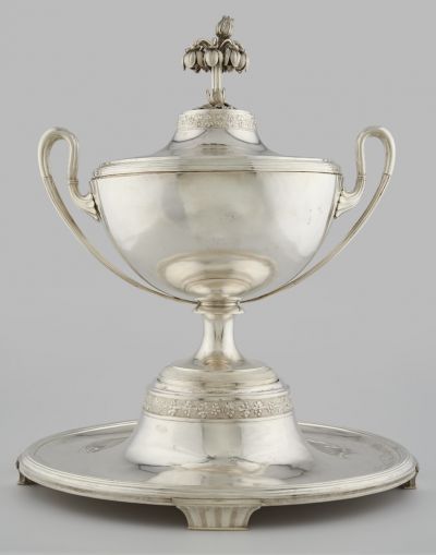 The dish consists of four parts: plinth, bowl, lid and inlet. On the rising part, the plain, round hollow plinth is decorated with engraved vine leaves against a punched base. It stands on four broad, fluted legs. The round, jointed foot of the bowl is engraved with a frieze. It has a plain cone and a plain, drooping collar below the bowl. There is a curved, cast double handle on each side, joining the bowl with a lobed cornet. The inlet is plain, with an oval finial on each side. The domed part of the lid is decorated with motifs similar to those of the plinth. An embossed bunch of snow drops appears on the top. According to the previous owner, the lid was decorated with the engraved coat of arms of Count Janos Mikes, bishop of Szombathely, which was later removed. Marked separately with town and maker's mark on each part.