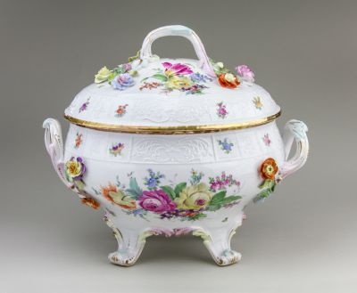 Tureen with lid - decorated with painted and sculptural flowers