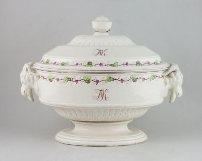 The splayed, fluted bowl with a rising rim and a relief goat-head handle on each side stands on a jointed foot. The narrowing, fluted lid has a vase finial. The rim of the bowl and the borders of the lid are lined by reddish brown, black and green foliage. The sides show calligraphic AK initials of reddish brown. Csanyi, in his study referred to below, dates the dish to 1804, yet the manufacture of dishes covered with transparent lead glaze - like the one described above - was common at about the time creamware manufacture started, that is, at the end of the 1780's and the beginning of the 1790's. The motifs can certainly be attributed to Johann Leitl. Marked with an impressed „HOLLITSCH” on the bottom.