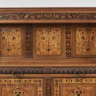 The two-storey cupboard stands on a plinth. The front of the prismatic bottom part has two doors, flanked by lisenes on the corners and in the centre. The doors are surmounted by a protruding corniche, hiding two drawers with stirrup-shaped iron pulls. The top part is narrow, used first of all for the display of ornamental dishes. There are three doored compartments flanked by the corner and the central lisenes. The whole surface of the front is inlaid, showing chalice vases placed in curved compartments in a rectangular frame, with stylised flowers bending from them. The decoration is enriched with other, symmetrically arranged and stylised floral, geometrical and fantastic architectural motifs. This two-storey cupboard is a copy of the Renaissance "Überbauschrank" with the coat of arms of the Reck and Kreps families, which is now in the Stadtmuseum of Cologne (Inv.No. RM 683/1937). It was designed by architect Josef Storck (1830-1902), who was director and professor of the Kunstgewerbeschule in Vienna. This school was founded almost parallel with the "Österreichisches Museum für Kunst und Industrie" (today: Österreichisches Museum für Angewandte Kunst. Storck was a renowned organizer and celebrity of the Austrian industrial (and furniture) art in the 1870s and 80s, and from 1876 he was also editor of the "Blätter für Kunstgewerbe" magazine, which was founded by Valentin Teirich. According to the notes of the old inventory book of the Budapest Museum of Applied Arts, the two-storey cupboard described above was present at the 1873 Viennese International Exhibition, and had been donated to the Museum in the same year by Baron Hirsch. The cupboard was made in the apprentice school for carpentry in Walachisch-Meseritsch, Moravia, while all the ironwork were produced in the metalwork factory of Hohenbrück (Trebechovice), Bohemia. The Viennese Österreichisches Museum für Kunst und Industrie, founded in 1864, was anxious to found new apprentice schools in those parts of the empire where a certain field of applied arts was already popular. Thus, during the 1870s they succeeded in setting up a number of special apprentice schools in various provinces of the empire, such as the drawing schools of Haida and Gablonz in Bohemia, and the woodwork apprentice school of Walachisch-Meseritsch, Moravia. All of these schools were somehow - directly or less directly - connected with the Viennese museum. Several objects from the Viennese Kunstgewerbeschule, made after the designs, drawings or models of the teachers, prove that there was a real demand for the high quality of industrial products. Already at the 1873 exhibition, these pieces had a decisive role in Austrian artistic crafts. In this respect, Professor Josef Storck was a leading personality. The two-storey cupboard described above was modelled on a buffet, or Überbauschrank-type which was fairly popular in sixteenth century Germany. The varied intarsia of those days was introduced by Cologne, at least in North-Germany. The flourishing of Cologne intarsia furniture is put between 1580 and 1600. In the second half of the nineteenth century a great number of these pieces were copied in Cologne in order to satisfy the market for "German Renaissance", a style that again became popular at that time. The original cupboard, bearing the coat of arms of Cologne, had been made in 1599 and was published between 1871 and 1875 in Leipzig by August Ortwein. The drawing of the copy which is now in the Budapest Museum of Applied Arts was published by Josef Storck, in the eighth volume of the 1879 issue of the “Blätter für Kunstgewerbe" magazine, under the heading "Intarsia-Kasten". The faithful imitation lacks only the original date and the coat of arms of the two families.