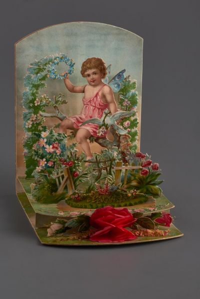 layers of reducing size, there are embossed, stamped, coloured pictures of rose stems, a small cupid with butterfly wings, sitting on a tree trunk, holding a wreath of forget-me-nots in his right, and a wild rose, a dove, roses and flowers. The motifs and approaches of this cart is similar to that of Inv. No. MLT 5359- The combination of panels of various origin was a typical feature of historicism, just like the gushy, sentimental atmosphere of the greeting cards in this period.