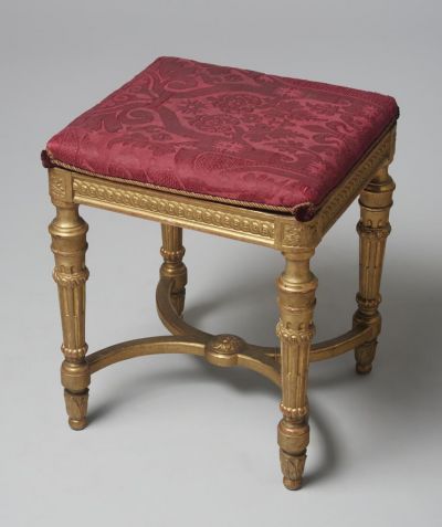 The stool stands on four flooted legs that are joint by two semicircular stretchers with a carved rosette at the juncture in the middle. The seat rail is carved with ribbon motifs, while the corners are decorated with carved rosettes in squares. The burgundy upholstery has leaf pattern.