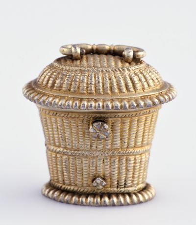 There is a horse, with its head bent to the side and its foot raised, standing on a round, turned, brown wooden plinth. The rider is a bearded knight wearing Spanish armour clothes, sitting on a caparison.