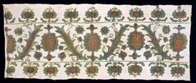 The middle line is decorated with foliage of large serrated acanthus leaves with a pomegranate in each curve. The leaves are further enriched with tulips and radial rosettes. The two outer borders are with rows of pomegranates above two lobed leaves. This piece is a representative of a highly stylized and richly decorated type of domestic embroidery.