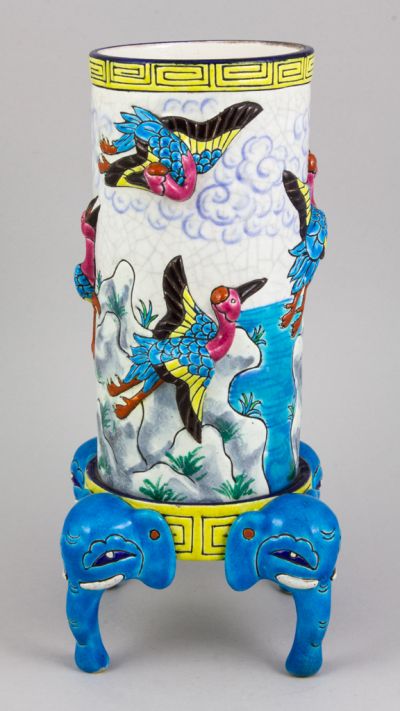 The vase was modelled on far-eastern, Chinese pieces, though it has unmistakeable European characteristics. The round plinth, supported by the four relief elephant heads, holds a straight, cylindrical body. The relief, lively coloured illustration runs around the whole vase: two rocks standing in the sea, covered with a little grass, surmounted by the symbols of immortality: six cane birds in high relief, starting to fly. The illustration is strongly stylized, creating a happy atmosphere with the use of turquoise, lilac, green and terracotta against the white base. The plinth and the top rim of the vase shows the geometrical lei-wen (lightning) motif, as a frame of the central illustration.