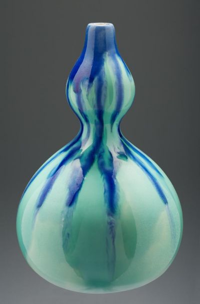 A gourd-shape vase, cast. The influence of the Far- East, in shape and glaze is apparent in the cobalt blue coulée glaze over the delicate, light green base, flowing into eleven lines starting from the top rim. An extremely simple yet attractive vase which exploits the natural characteristics of the glaze.