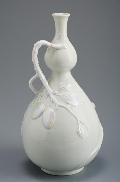The top rim of the gourd-shaped vase is slightly splayed. The rich, impressed decoration consists of the following motifs: a lizard, a plum bough with leaves and fruits. The stem of the bough rises high then curves back in a handle-shape.