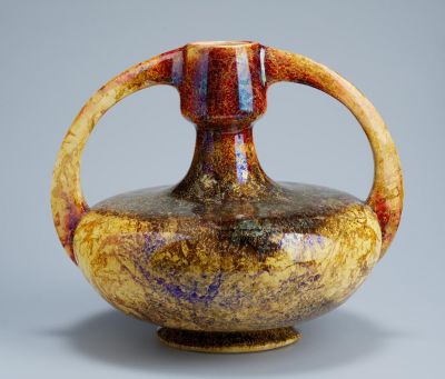 The outline of the hemispherical body of the vase is “completed” by the handles connecting the body with the top rim. The rounded shoulder line supports a conical neck and a splaying, then narrowing top rim. The turned shape follows North-European, geometrical models, while the marbled decoration is the revival of J. Wedgwood's glazes imitating precious stones.