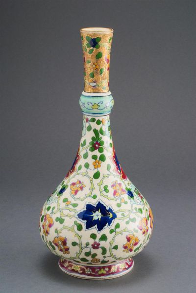 Techniques: | cast form; contoured with gold; covered with polychrome glazes |