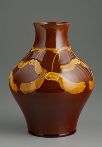 The body strongly splays towards the top, with a wide neck and a short, curved, splaying top brim. The body and the shoulder line is decorated with thin boughs, with maple fruit hanging down from them. The body is dark brown, the ornaments are white.