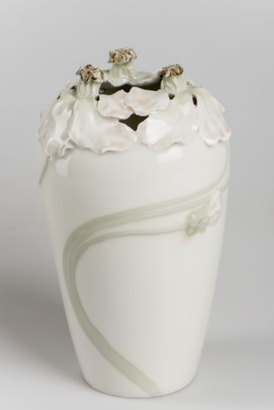 The designer of the Art Nouveau style vases studied in Stockholm and in Paris. His works are graceful and lyrically picturesque he completed the serial produced vase bodies with his delicately modelled plastic paintings that he detailed with underglaze pastel colours. Alf Wallander designed for the Swedish porcelain works for nearly twenty years. During his art leadership the Lidköping factory was in its glory.
