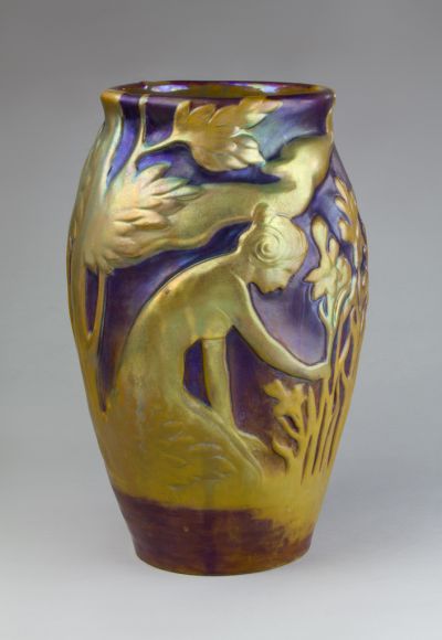 The foot of the large vase is straight, supporting a slightly bulging body. The surface shows a low relief scene of a kneeling girl picking flowers under a tree with split trunk. Her hair is combed into a scrolling diabolo knot and she is holding a large lily stem in her right hand. Behind the lily group a leafy bush and a path appear in the distance. There are two lines of clouds in the sky. The picture is simple the relief effect is enhanced by the colouring. The background is purple and golden brown, while the protruding surfaces are shaded with lighter bronzish-gold. This vase was exhibited at the 1900 Paris International Exhibition, where Sándor Apáti Abt won a silver medal.