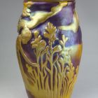 The foot of the large vase is straight, supporting a slightly bulging body. The surface shows a low relief scene of a kneeling girl picking flowers under a tree with split trunk. Her hair is combed into a scrolling diabolo knot and she is holding a large lily stem in her right hand. Behind the lily group a leafy bush and a path appear in the distance. There are two lines of clouds in the sky. The picture is simple the relief effect is enhanced by the colouring. The background is purple and golden brown, while the protruding surfaces are shaded with lighter bronzish-gold. This vase was exhibited at the 1900 Paris International Exhibition, where Sándor Apáti Abt won a silver medal.
