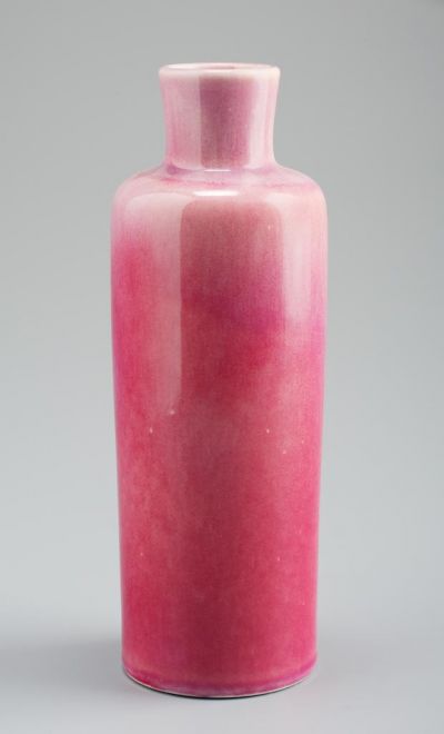The slightly splaying, cylindrical body with rounded shoulders stands on a straight foot rim and ends in a slightly splaying cylindrical neck with a round top rim. The basic purple-pink colour is enriched with a lighter coulee glaze in a fine line pattern.
