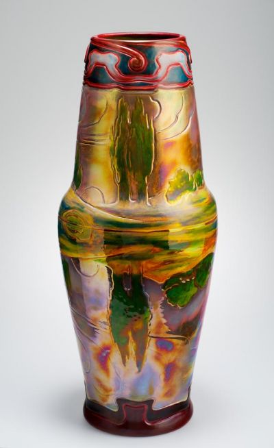 The vase is shaped of two joined truncated cones. The straight, round foot and the top rim are lined with broad border motifs. At the top, an Oriental cloud motif is repeated four times. The bottom border is decorated with a wavy geometrical pattern. There is an alley of poplar trees leading to the distance from the bushy shore. The setting sun appears behind the hills there are clouds in the sky. All this is reflected in the water, bright but washed-out. The rich scale of dark purple, goldenbrown, violet, green and mother-of-pearl lend emotions to the line drawing. The picture on the vase, although simpler and beautifully coloured, is the same that was published in the magazine Ver Sacrum Vol. I, 1898, book XI, as an illustration to a poem. The designer reinterpreted the 8th drawing in the series of Adolf Böhm ”Zehn Gedichte von Arno Holtz”, using all the rich potential of Zsolnay technology. The atmosphere of the symbolist picture on the vase matches well the text of Arno Holtz: "Am stillen See /sitz' ich und starre / in ein gespiegeltes Paradies.” The drawing No.7332 in the Zsolnay factory Façonbook shows not only the silhouette of the vase but also the indented contours. Remark: «geformt 53 cm hoch (Abt mintja) terv. 1904 szept.2.»