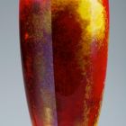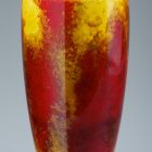 The tapering, slightly curved, cylindrical body stands on a straight, round foot. The shoulder is bent at right angles, the top rim is slightly splayed. The plain surface is decorated with bright, transparent, polychrome glazes. The richly shaded yellow, brown, and red patches are covered with the reflections of bluish purple, creating a polished semi-precious stone effect.