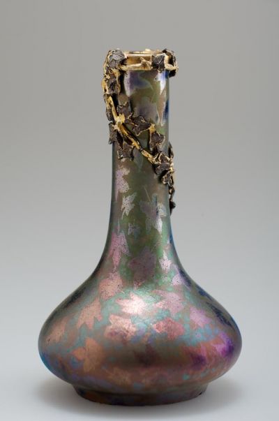 The bun-shaped body is topped by a long, slim, cylindrical neck. Scattered ivy leaves painted in lustre against the greenish-purple background, decorate the surface. There is a relief, silver gilt ivy bough running around the top rim, with one twig twisting around the neck of the vase.