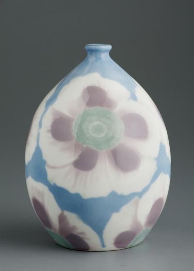 The egg-shaped body ends in a short, narrow neck and a slightly splaying top brim. The body is decorated with flowers of five petals and a strong pistil, painted in light blue, light green and light violet against the blue base.