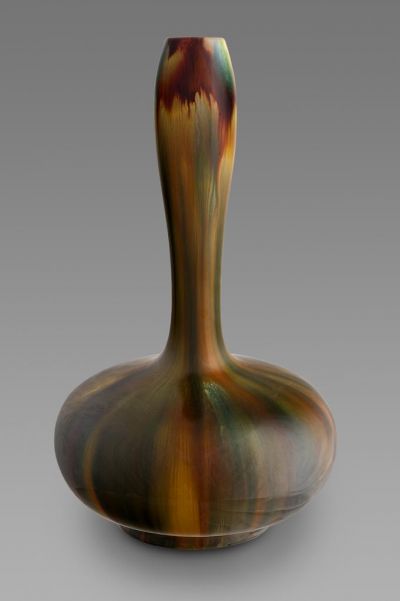 The bun-shaped body stands on a foot rim, and continued in a long, slim neck that slightly bulges at the top and tightens up again at the top rim. The soft, coulee glaze is bright, with yellow, blue, grey and red colours at the top and melted greenish, brownish-yellow at the body.