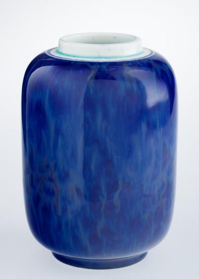 The cylindrical body is rounded at the top and bottom, standing on a narrow foot rim. The neck is a short, narrow ring, with a straight top rim. The plain surface is decorated with an iridescent, bright, irregularly spotted glaze. On the neck, the transparent, glassy, light green glaze is covered with a thick ultra- marine one. The artistic, refined and vivid effect is the result of the different glazes melting together.