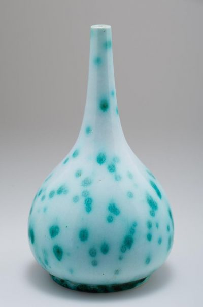 The pear-shaped body stands on a narrow foot rim, ending in a high neck and a narrow, round top. The plain surface is decorated with chrome green, crystal glaze patches over the light grey and violet ground colour.