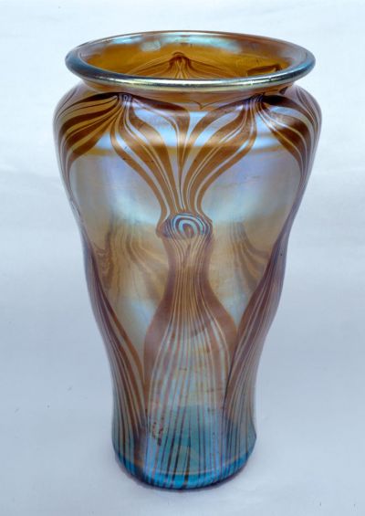 The splaying, wavy sides of the body narrow below the top rim. The whole surface is covered with stylized tendrils and leaves shaped of brown, embedded glass thread. The glass has an iridescent effect in places.