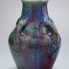 The pear-shaped body has a broad neck and a slightly splaying top rim. The body and the shoulder are connected by four handles of a slight curve. The neck is decorated with geometrical motifs of circles, lines and stylized trefoils, impressed. Marbled coulee glaze with light blue, purple, grey and red stains.
