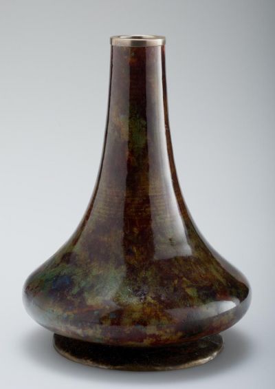 The shape and decoration is identical with Cat. No. 9.201, described above, being a little smaller in size. The marbled enamel is also a colour variant, dominated by brown, greenish and dark crimson.