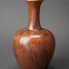 The splayed body has a rounded shoulder line, a slim, long neck and a hornet-shaped, splayed top rim. The nut-brown glaze is decorated with scattered dark brown, metallic spots and crystals, imitating aventurine stone.