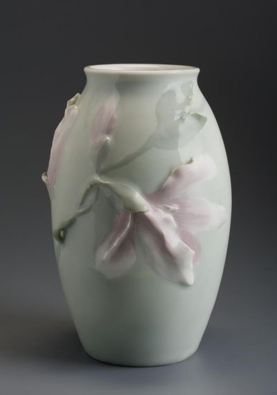 The eggshaped body has a broad top brim with a slightly splaying rim. The surface is embossed with stylized flowers and buds, painted in light grayish green, green and violet under glaze.