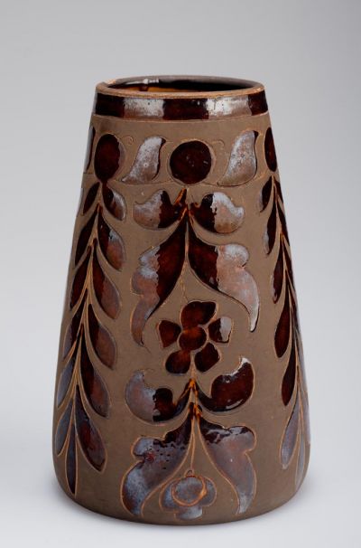 A truncated cone shape, with slightly curved sides. The top rim is lined with a thin yellow stripe, from which the two alternating leafy and flowery leafy garlands spring symmetrically. The folkloric pattern is done in bright slip over a matte base.