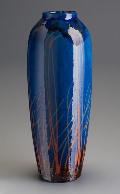 The slim, splaying vase has a curved neck and a narrowing top rim. The surface is decorated with long, reed-like, scattered plants of black maces. The base is dark blue, painted in rust brown and black.