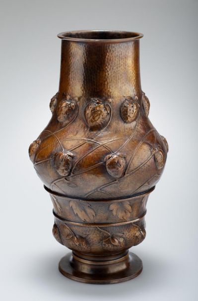 The round, jointed foot supports a slim stem that holds the bulging body of a slimmer neck. The stem is divided with two rings, decorated with pattern lines of strawberries and strawberry leaves. They are surmounted by a curving, symmetrically arranged ornament of fruits with bent stems. The base and the surface of each motif are differently decorated. A piece of identical shape and decoration was exhibited at the 1900 Christmas exhibition of the Society for Applied Arts, its ill. published in Magyar Iparművészet Vol.4, 1901, p.69.