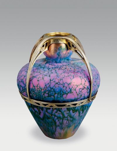 The small, round foot supports a stout, bulging body with a rather narrow shoulder, and a short, cylindrical neck. There is a circular band running around the shoulder line, with four pierced ribs connecting it to the top rim. The whole surface is covered with a refined, iridescent enamel of different shades, which was typical of Rapoport's other pieces as well. This piece - together with others covered with the same type of enamel, were given gold medal at the 1902 Torino exhibition.