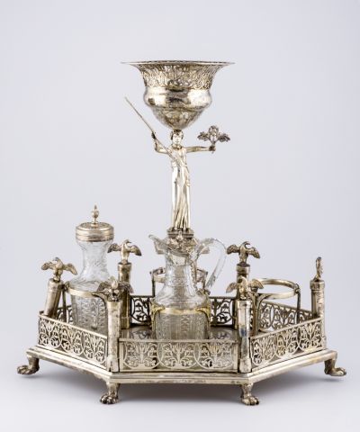 The plinth with six sides has a pierced rim of leaf and flower motifs. There are six plain, cast columns on the plinth, supporting cast, punched and engraved eagles with spread wings. There is a jointed prismatic post in the middle, decorated with palmettes and flowers against a punched base. It holds a female figure, in antique garb, holding an arrow and flowers in her hands. A flat bowl with a pierced rim is placed on top of her head. Marked with separate town and maker's mark, impressed on each part. The stopper of the glass oil cruet is of plain silver, equipped with a joint vase finial and a cast chain hook. The cover of the vinegar cruet is decorated with pierced leaf motifs its rim is engraved. The finial is identical with that of the oil cruet.