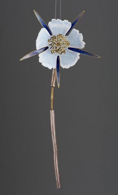 The slightly curved, silver stem can be screwed apart. The transparent, blue opaque wild rose of five petals (Rosa canina) is also detachable, etched matte. Between the petals, there is a long, narrow sepal, while the centre shows a number of tiny pistils. The sepals are covered with blue, the pistils with green enamel. According to the letter of Jenő Radisics written to Rene Lalique in 1904 (see Museum’s Archives, No. 261/1904), the flower was a part of Jean-Paul Aube's statue "La Reconnaissance", which depicted a female figure holding a flower in her hand. The statue won Grand Prix at the 1900 Paris International Exhibition and Jenő Radisics bought it. The flower acquired by the museum in 1904 probably replaced the missing original.