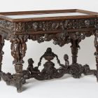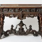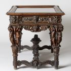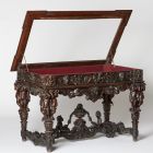 The table stands on four cylindrical feet, decorated with rosettes and egg-and-dart motifs at the bottom and three carved putti clinging on the horn of a ram at the top. The shorter sides are joint by a stretcher with scroll and rosette motifs, while the middle stretcher has a richer decoration of a flower urn and two putti on the sides. The frieze is pierced with flowery angel heads at the bottom, a winged female herm and a satyr head twisted with ribbon at the top. The middle presents the allegory of the river: a naked female and male figure resting their heads on their right and pouring water from the carafe in their left. The wooden frame of the folding glass top is decorated with flat-carved rhomboid motifs twined on a leaved tendril. The inside of the table used to be lined with velvet. It presents the characteristic signs of French (Burgundy) Mannerism and was made in France or, on French influence, in Central Europe. It used to belong to the drawing room furniture of György Rath and served as a store for keeping gemmas. (see Archives Department of the Budapest Museum of Applied Arts Fit 4869.) The inventory number 690 of the Rath collections can be seen on the object.