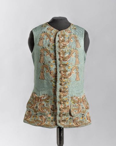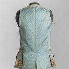 The waistcoat is cut in the Western-European fashion without sleeves and with hip-length pockets with a flap. Fastened at the front with buttons, it is embroidered in metal thread.