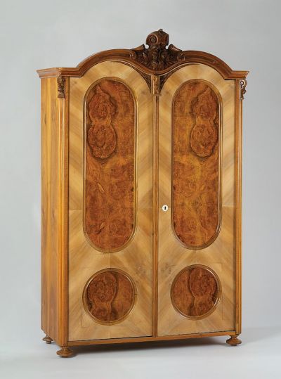 The. wardrobe: with two wings stands on four bun feet. It forms an upright prism and has two doors, with an elongated oval panel at the top and a round one at the bottom. The pilasters end in roses. The middle of the curved and jointed top corniche is carved with an ornament of scrolls, leaves and roses. One wardrobe is marked inside, top left with KATHARINA STAMER while the other shows KS initials on the back and KATHARINA STAMER inscription on the top, inside all these burnt-in marks refer to the grandmother of the donator.
