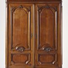 Wardrobe: it stands on four turned bun feet. There are two drawers above the protruding, rounded frieze, decorated with a carved line that ends in a volute. Both doors are divided into a smaller, lobed field at the bottom and a larger one at the top, with a rounded upper part. The bottom parts of the upper fields are carved with shells, while the middle of the curve is decorated with carved leaves. The sides of the curve are enriched with incised nets. Its significantly protruding corniche is jointed several times, the two middle volutes rise in a curve. Below the volutes there is a carved shell motif and incised net on the sides. The keyhole shield and the pulls are cast brass. The sides of the wardrobe are plain, with a slightly protruding frame. One of the wardrobes is equipped with coat hangers while the other has shelves.