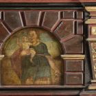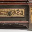 The plinth of the huge, heavy softwood chest is decorated with an undulating line cut into the front and with hearts cut into the two sides. Inside are two drawers with round iron mounts, a console with gold painted bay leaves stands in the middle. The plinth shows two figures, one at each end. On the left, is the groom, in Hungarian noble's clothing, holding a glass. It has faded, and is hardly recognizable today. On the right, is the bride, holding a wreath. The sides are decorated with four broad frames that enclose foliage decoration painted on a white background. The two upper fields have iron mounts. Inside, is a profiled smaller chest, and there are five small green drawers on the back of the chest, with round iron mounts. In the rusticated arches on the left, Lucretia is pictured thrusting a dagger into her heart. On the right, we see three quarters of the figure of Cornelia, painted in rich colours.