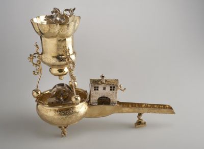Richly decorated, the guilds’ drinking vessels represented the community of members and bore the instruments or symbols of their craft. They were used at the guild’s ceremonial reunions. The Vienna Millers' guild vessel has an extraordinary form: the wine filled into its cup turns the miniature mill’s wheel.
