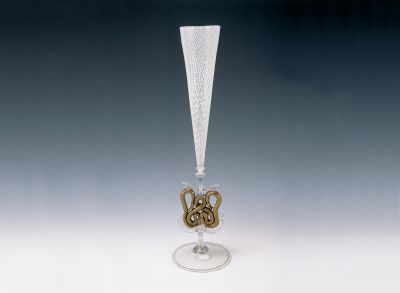 The body of the glass is entwined by a white glass twine net. Between the small lozenges making up the net small air bubbles can be seen due to the manufacturing technique. These create a form of dynamic structure, revived by light. This net decoration favoured by Renaissance is held by a special “wing”: an aventurin-glass copper snake. The imaginary animal with copper shine is made in the astonishing style of the Murano glasses of the 1870s and 1880s.