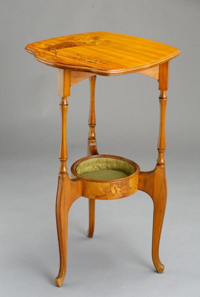 The three lathe-turned legs are joined by a circular sewing box. The top of the table is curved, irregularly wavy, decorated with intarsia: a bunch of violets in a vase and the referring inscription (probably a detail from a Parisian chanson of that time): ELLE SOURIT CHARME ET PARFUME / VIOLETTE DE LA MAISON.