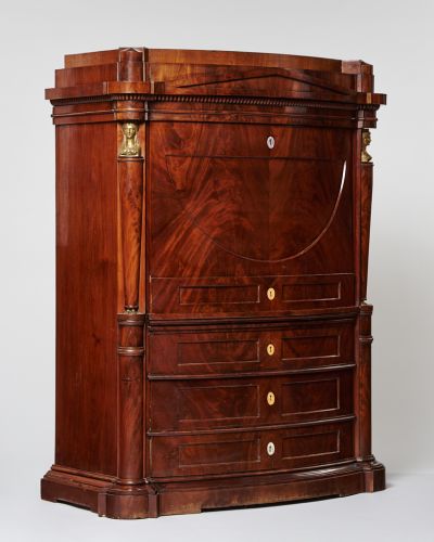 The short plinth with a jointed rim follows the slightly swelling line of the front. The bottom of the cabinet conceals three drawers, with slightly embedded inlays and oval keyhole shields. The cut corner fields of the cabinet are decorated with engaged columns. The outside of the folding plate shows a slightly embedded, arched inlay. On its inside there is a secret compartment, lined with light blue wallpaper, which opens with a spring mechanism. Behind the plate, in the middle, is a wider compartment, veneered with mahogany, which is covered with a small door imitating an arched entrance. The door is flanked by two pilasters. It is surmounted by a drawer panel, which is decorated with a mirror and a baluster. The drawers are placed as follows: there is a broad drawer at the bottom, surmounted by three small ones on each side a drawer of double width is placed on top of each side. Some of the small drawers are divided into compartments. The top is closed by two horizontal prismatic corniches, placed on a triangle- shaped pediment. The stylistic features of this cabinet indicate that it belongs to the North-German type furniture the structure is clumsy and the decoration is far from varied. The use of a plinth instead of feet, and the rectangular, clumsy forms of the top corniche are typical of the furniture made in this area. The decoration is restricted mainly to flat inlays, which are usually embedded, and geometrical. The natural beauty of the veined veneer, on the other hand, is able to unite all elements of the piece.