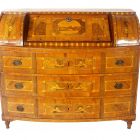The horizontal prismatic body stands on four fluted, splayed feet, forming truncated pyramids. The front is slightly bulging. The bottom part hides three drawers, the panels of which are divided into three parts with a broad, rectangular, inlaid field in the middle, and two narrow inlaid fields on the sides. The middle fields of the drawer panels are framed by meander inlays, while there is a flower inlay of a lighter type of wood, to the right and left of the keyhole shields. In the top part, on both sides of the slanted writing plate are drawers. This construction is probably a variant of the cylindrical topping, which requires a more complicated technique. The top is horizontal. In the middle of the oval writing plate is an inlaid scene of a village street, in a rectangular meander framework. The bowed side drawers are decorated with flowers in full blossom, placed in rectangular fields.