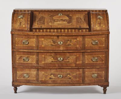 The horizontal prismatic body stands on four fluted, splayed feet, forming truncated pyramids. The front is slightly bulging. The bottom part hides three drawers, the panels of which are divided into three parts with a broad, rectangular, inlaid field in the middle, and two narrow inlaid fields on the sides. The middle fields of the drawer panels are framed by meander inlays, while there is a flower inlay of a lighter type of wood, to the right and left of the keyhole shields. In the top part, on both sides of the slanted writing plate are drawers. This construction is probably a variant of the cylindrical topping, which requires a more complicated technique. The top is horizontal. In the middle of the oval writing plate is an inlaid scene of a village street, in a rectangular meander framework. The bowed side drawers are decorated with flowers in full blossom, placed in rectangular fields.