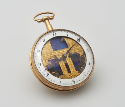 The watch has a double cover, a joint rim, a pierced cock of brass, a strike mechanism, and a white enamel dial with black Arabic numerals. There is a gold-plated picture in the middle of the dial, showing a bearded figure striking a bell with a hammer, in an architectural scene with columns. At the bottom, two sitting cupids strike bells. The back of the mechanism is engraved with the inscription “Berthoud a Paris”, while the inner cover shows “H. Meumier (sic!) a Paris No. 11968”. The hanger is oval.